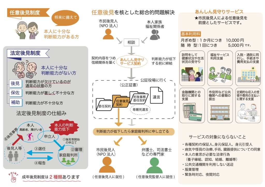事業内容testNPO概要 情報公開 寄付 会員募集 問い合わせ私たちは、このような活動を通じて組織を維持し、地域の皆様が安心して暮らせる社会の実現に貢献しています成年後見等受任(法定後見、任意後見)相談・支援事業講演会・講師派遣市民後見人養成講座、会員向け研修生活支援精神・心理相談